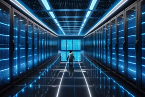 Egy pingvin sétál egy modern adatközpont folyosóján, tele szerverekkel.