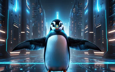 Egy pingvin áll egy futurisztikus adatközpontban, amely tele van szerverekkel.